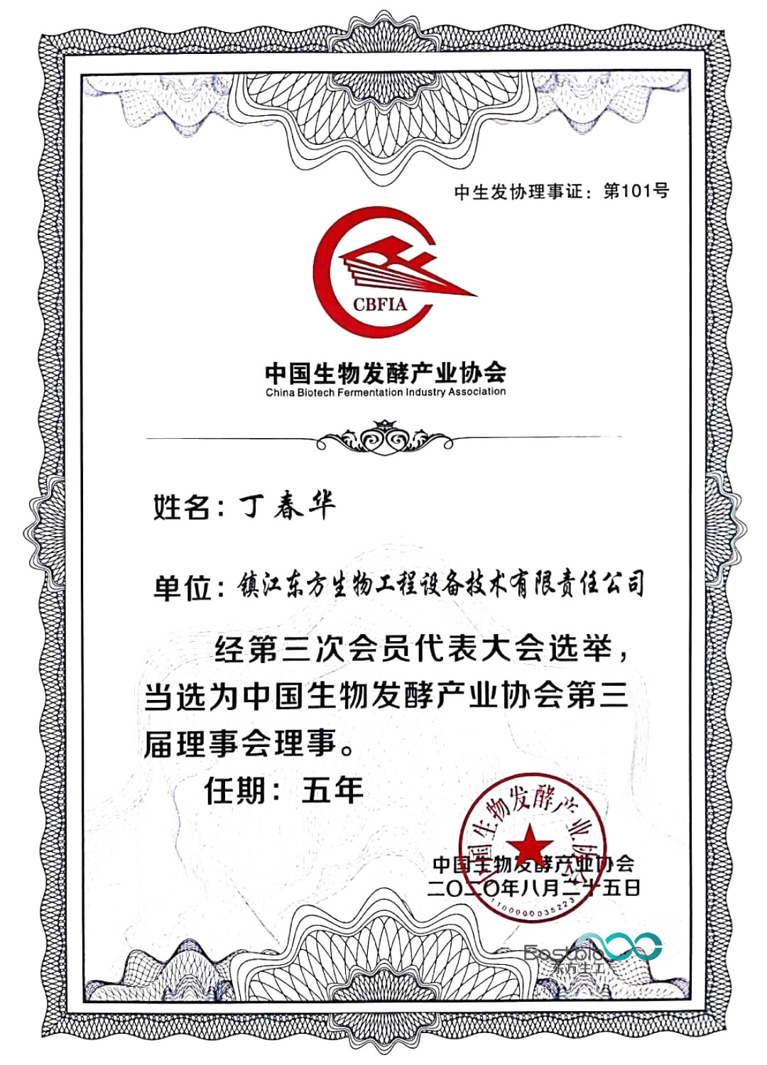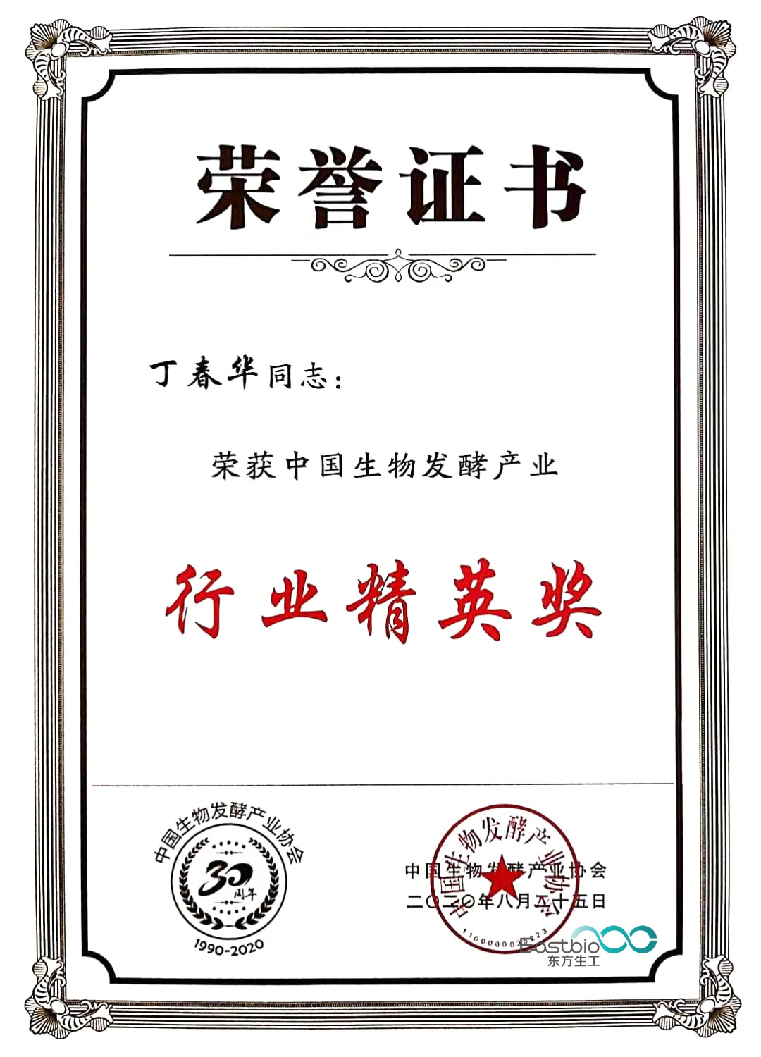 大会对中国生物发酵产业协会成立30年以来对行业发展有重大贡献的单位和个人进行了表彰。镇江东方生物工程设备技术有限责任公司获得了协会颁发的“创新贡献奖”,董事长丁春华荣获“行业精英奖”。同时丁春华董事长经第三次会员代表大会选举当选为中国生物发酵产业协会第三届理事会理事,任期五年。